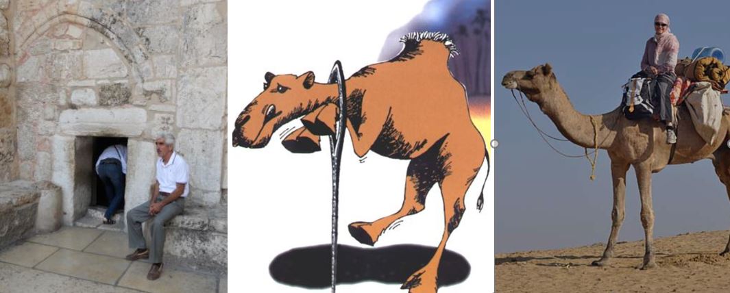 Bilde til venstre er en inngang som kalles nåløye, som gjerne forveksles med en synåls øye, som du ser i midten. På bilde til høyre så ser du at kamelen er ganske stor.